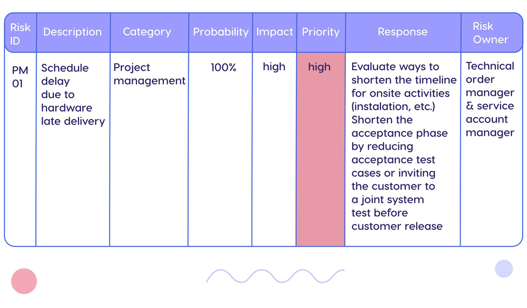 The description of risks should be short but informative. It’s also important to be aware of events that result in a risk, they can be also mentioned here. For example, implementing a new technology solution may result in a project delay.