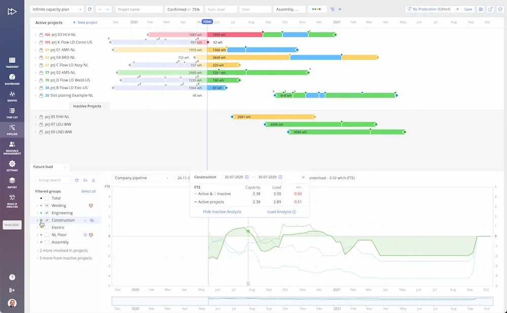 Besides, now Epicflow users can make a more detailed load analysis involving inactive projects. The Inactive Load Analysis feature makes it possible to see how loaded your resources will be in the future if you initiate them. You can filter your resource groups to see how exact group or individual resource will be loaded by the new amount of work. Take a look at the picture below.