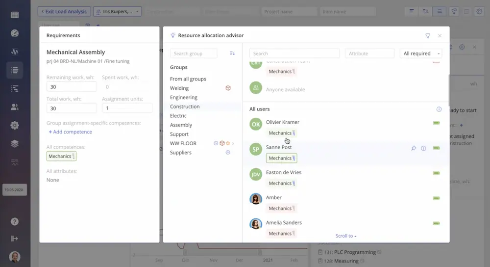 Now you have a clear view of your most loaded groups and can make the Load Analysis and then takes measures to balance it. Having reviewed the tasks that are overwhelming your resources, you can either move a milestone and see if this helps avoid overload in the future or open a Task Card of the most constraining task and go to the Resource Allocation Advisor to find another resource or a resource group for it (the one who has necessary competences, capacity, and is currently available). It also may happen that there are no suitable resources for the task in the group, so you can look for another resource outside this group.