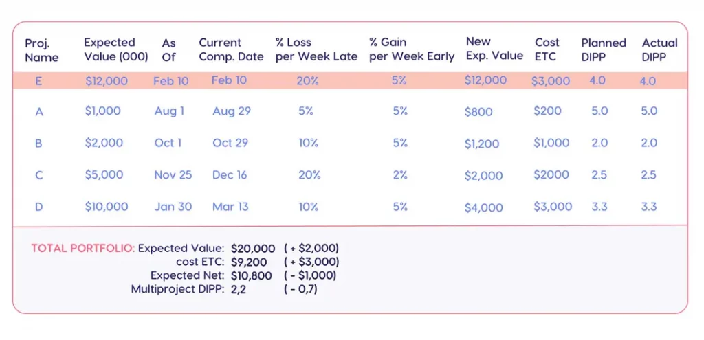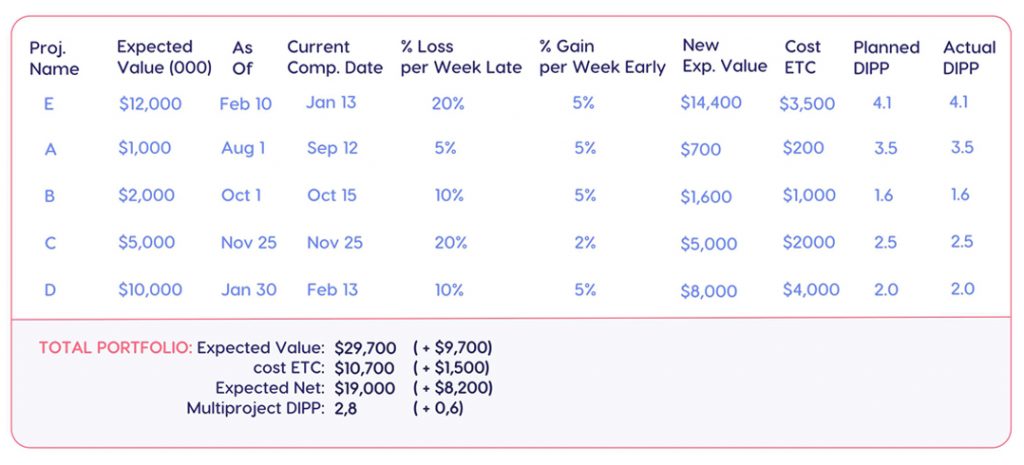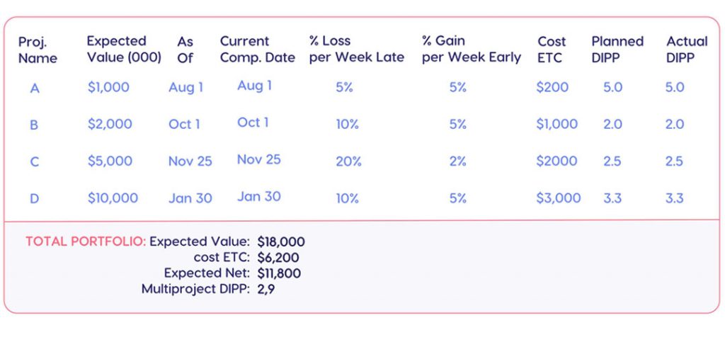 In other words, there is now a yardstick that will allow the portfolio manager to adjust the individual projects and resources, using the DIPP and profits as a barometer to ascertain a more profitable project profile.