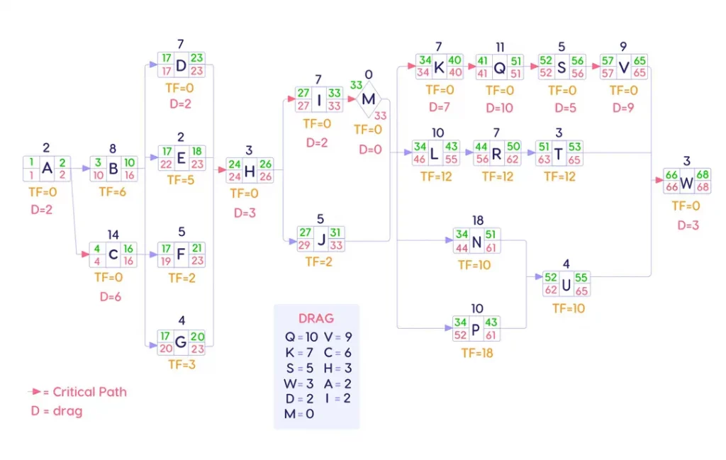 The drag calculation shows that Activity Q is adding 10 days to the project, more than any other task. Shrink Activity Q’s duration from 11 days to zero and its path (K-Q-S-V) would be 11 days shorter, at 21 days. The second longest parallel path, N-U, has a duration of 22 days, and so would now become the critical path with the drag of 1 day. Each activity on the path K-Q-S-V would now have a total float of 1 day. And the project would be completed 10 days earlier, on Day 58. That is why Q had 10 days of drag – it was adding 10 days to the project duration.