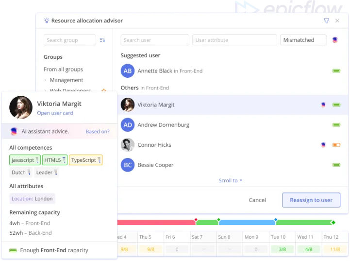 Project teams can keep working in their familiar Jira environment while management uses Epicflow to gain comprehensive insights into resource and portfolio performance and make predictions for informed decision-making.