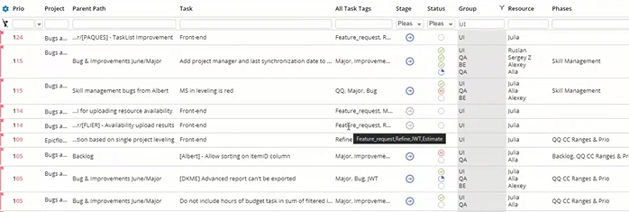 In Task List, you can look for parent summaries, tasks, and subtasks by applying the “All Task Tags” filter. Just type a keyword or its part and get what you’re looking for. When hovering over the line you can see all task tags in the popup.
