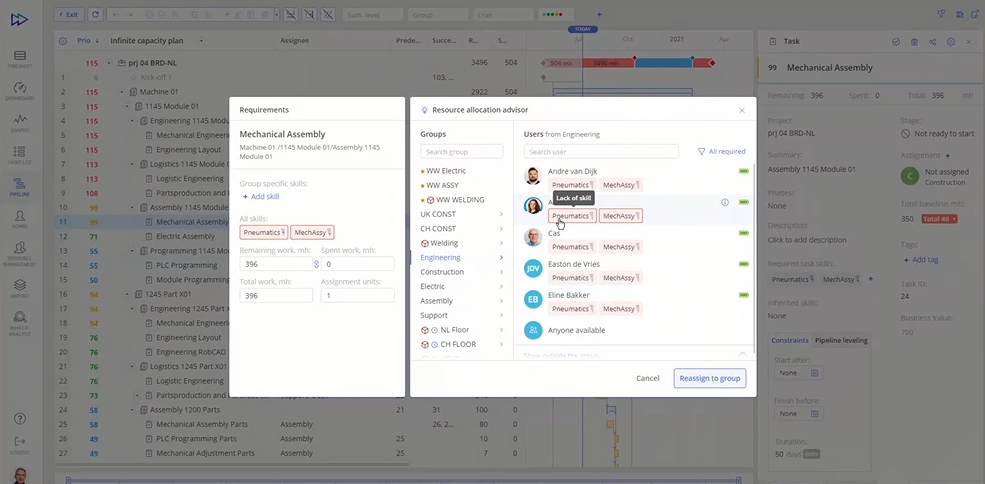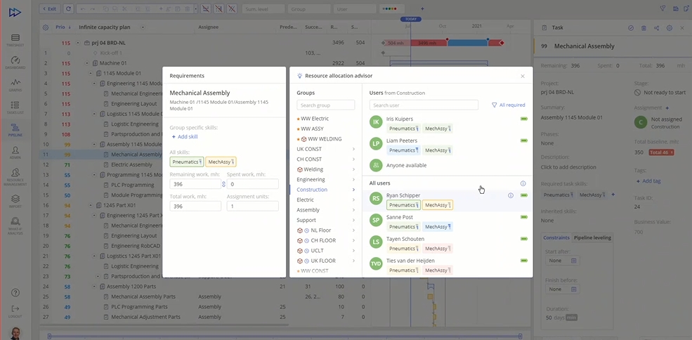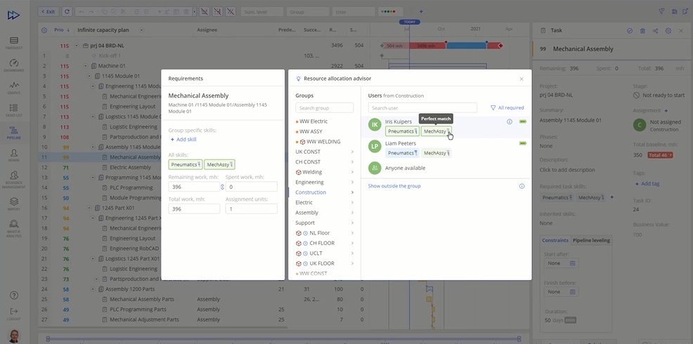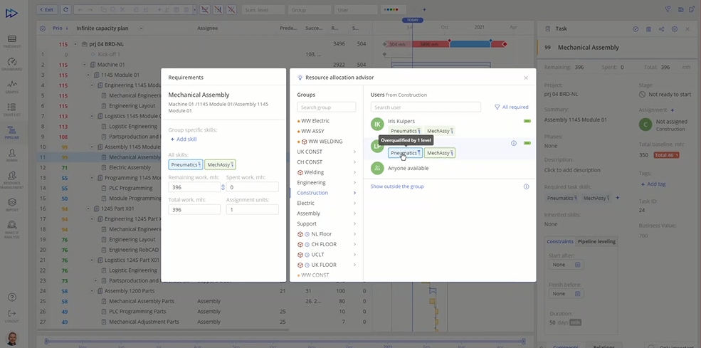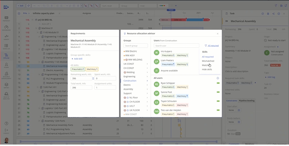 You can assign a task to a resource based on their skills. At the Task Card page, you can see a list of skills necessary for its completion and a list of resources with corresponding skills. Thus, you can choose the most suitable one for a certain task suggested by the system and make sure the task will be executed by the most competent expert in the field.