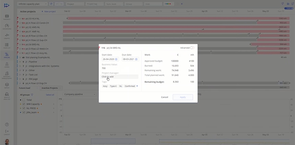 But even if a project manager is specified in the external system, you can change them in Epicflow. Just go to Project Card, select the project management field, choose another user, and apply the changes.