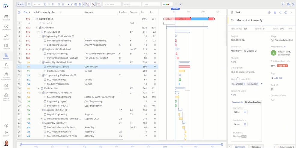 You as a project manager can set a leveling parameter based either on priority or business value. The system will automatically calculate the dates for the task execution and create a corresponding Gantt chart.