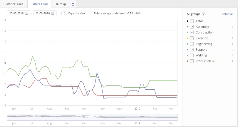- Historical Load Graph shows the changes in resources’ load and capacity over time as well as the amount of work performed.