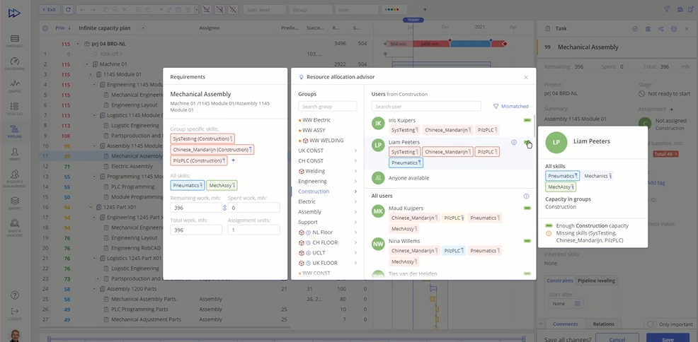 - If a resource doesn’t have the necessary skills or their level is too low for the task, it’s highlighted with red.