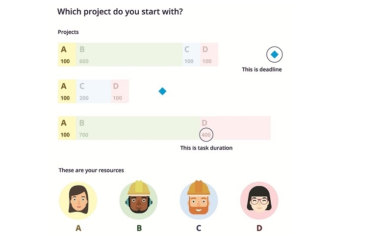 It’s a project management simulator that lets you immerse yourself into a multi-project environment and solve resource allocation issues. The goal is to finish all the projects before the deadline by assigning resources to the corresponding tasks.
